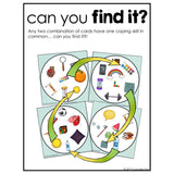 With your small groups or individual counseling students, draw 2 cards. Find the object that is on both cards. Then, use the coping skills reference card to talk more about how the item can be used as a calming strategy or coping skill. Give students a chance to share about a time when they have used this skill in the past or a time when it might be helpful for them in the future.