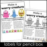 • Printable labels to create your own worry character kit in a standard sized pencil box.