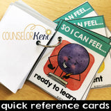 Feelings and Calming Strategies Poster - Need a quick tool for students to use in your calm down spot or counseling office? This feelings and calming strategies visual aid will help students identify their emotions and pick a coping skill! Use the poster or small 1-page visual, make a quick reference card deck, or make a desk reference for students to practice emotion regulation at school.