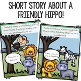 This classroom guidance lesson introduces students to 5 qualities of a great friend as they meet the friendliest hippo, Hector! A short story introduces honesty, inclusion, positivity, peaceful resolution, and observing others' feelings as key components of friendship. Students participate in a movement-based activity to practice including others and then create a tabbed book to write about or draw how they can demonstrate the 5 qualities!