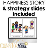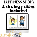 Kindergarten Happy Counseling Lesson - This happiness classroom counseling lesson plan will help students in grades K-1 understand what happiness is, why people feel happy, and easy ways to share their happiness with others! Students practice controlled breathing, picturing a happy place, and identify ways to share happiness with others using fun, movement-based activities and a song!