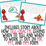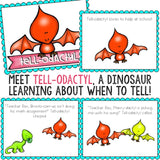 This elementary school counseling classroom guidance lesson introduces early elementary school students to situations in which they should tell their teacher and situations in which they should work it out on their own! Students meet Tell-odactyl, a dinosaur student who loves to tell the teacher what everyone else is doing. She learns about the times when she should tell and the times when she should try to work things out on her own! Students practice evaluating situations in a movement-based activity or with paddles.