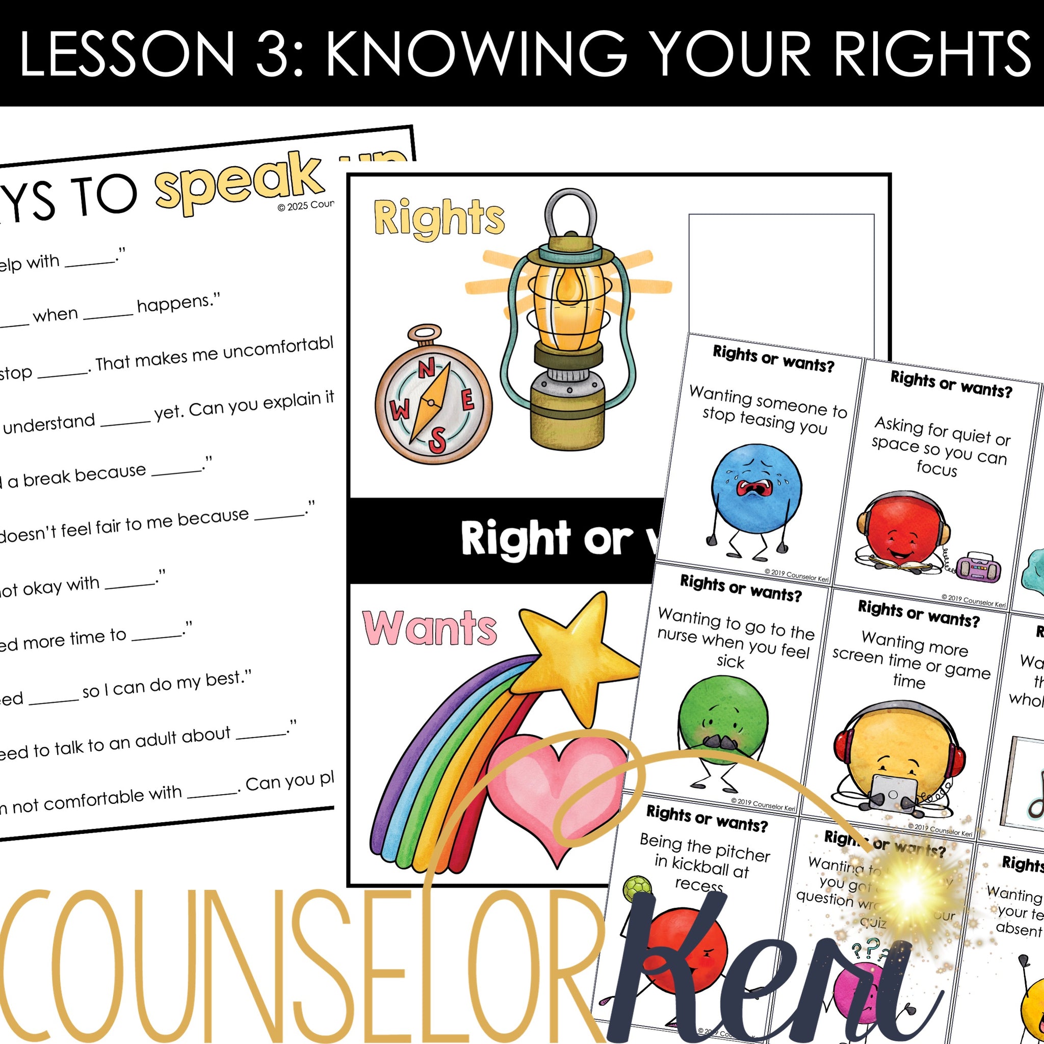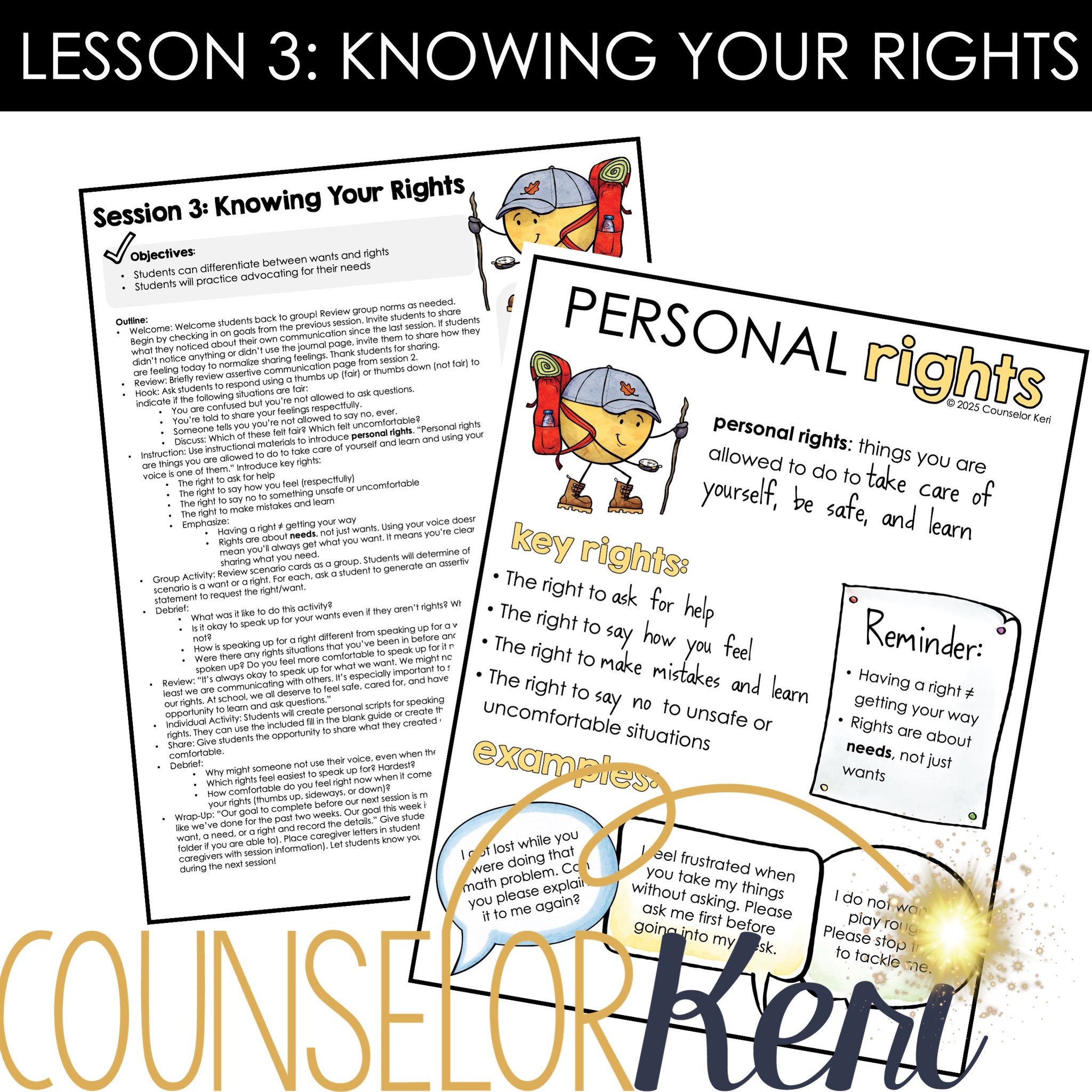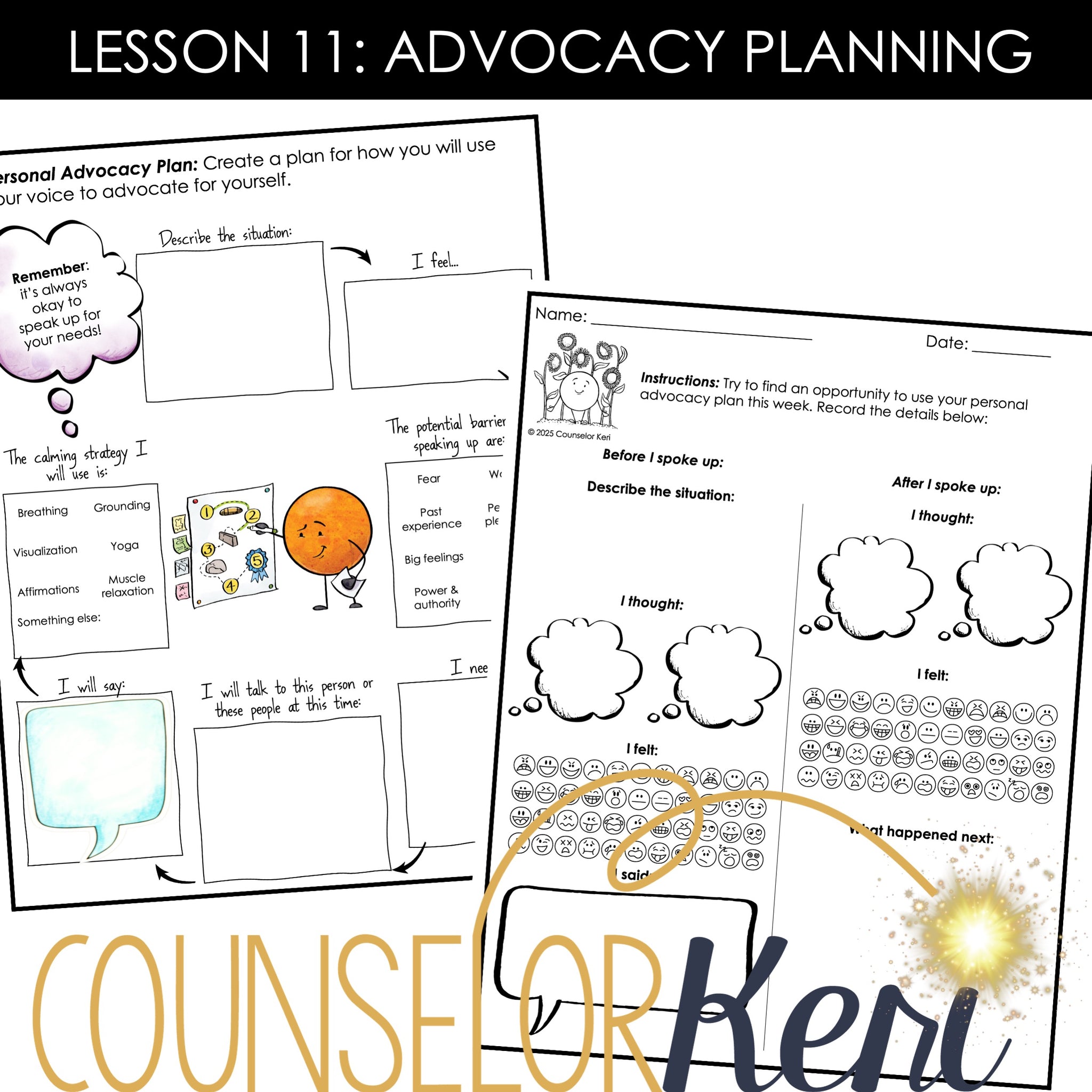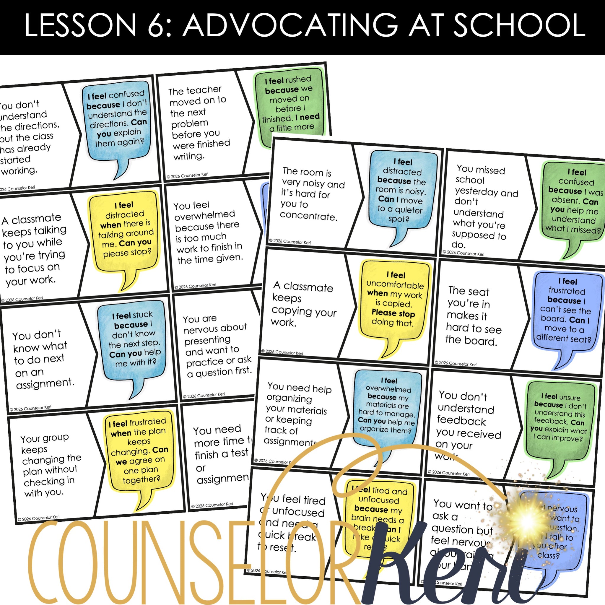 This 12-session counseling curriculum helps students develop assertive communication, self-advocacy skills, and confidence using their voice across school, peer, and home settings. These engaging, hands-on counseling lessons support students as they learn to identify feelings and needs, set boundaries, speak up respectfully, and advocate for themselves without shutting down or escalating conflict. Students will engage in interactive games, role plays, discussion activities, calming strategies, and real-world practice tools woven throughout each session. Every lesson provides structured opportunities for students to practice new skills in safe, supportive, and meaningful ways.