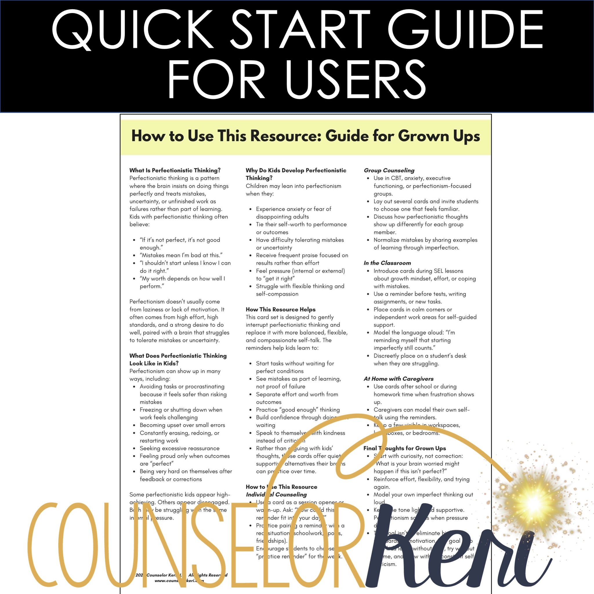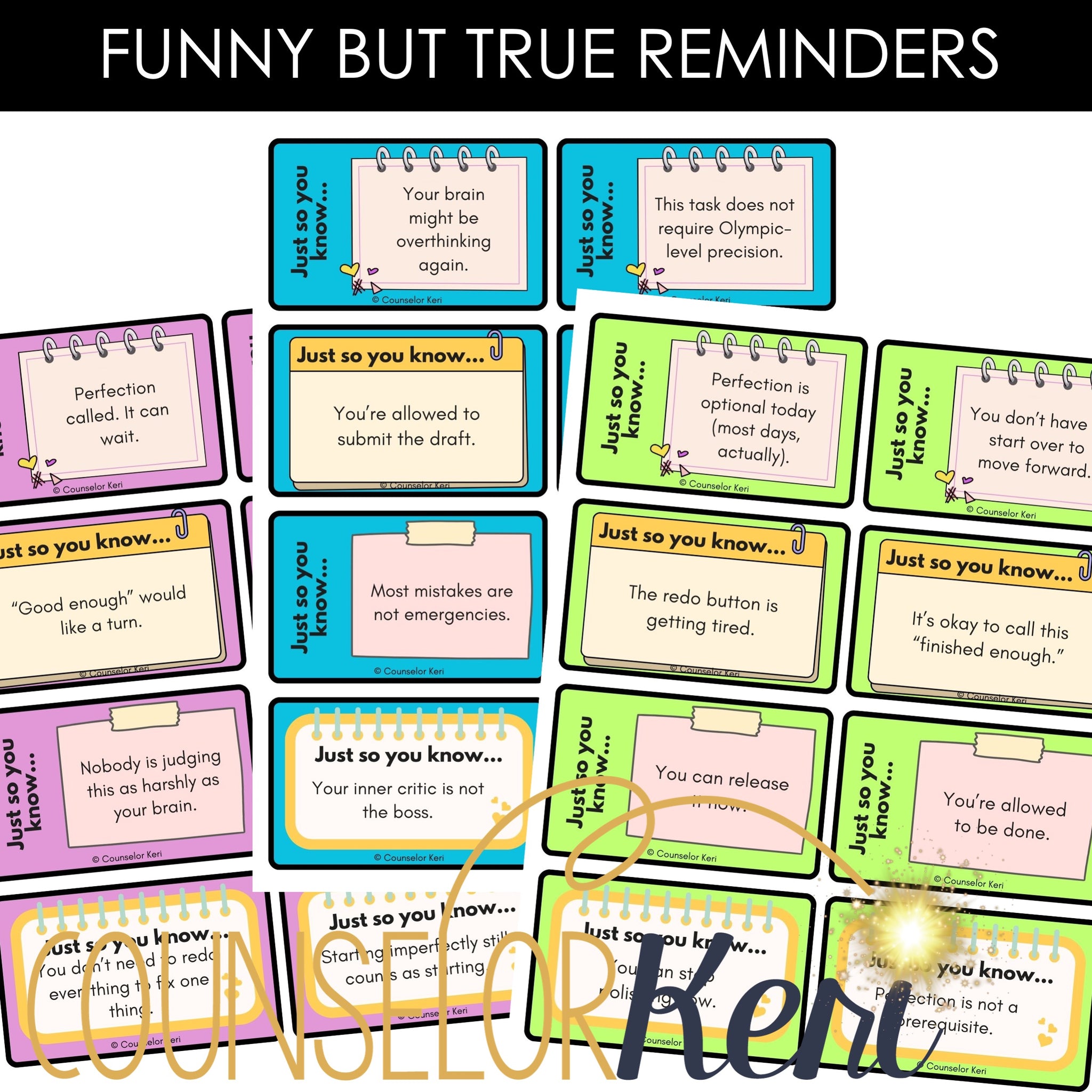 Perfectionistic Thinking Reminders are a supportive counseling tool designed to help students challenge rigid thinking, build cognitive flexibility, and develop a healthier growth mindset. This resource is ideal for school counselors, teachers, and caregivers supporting students who struggle with perfectionistic thinking, fear of mistakes, task avoidance, or harsh self-criticism.