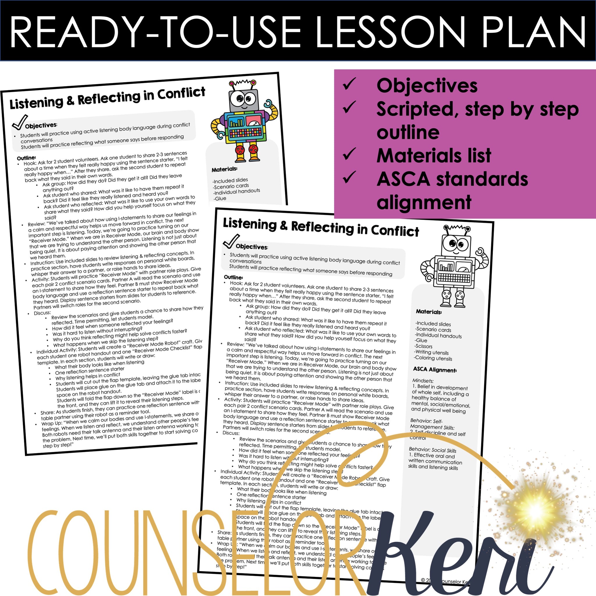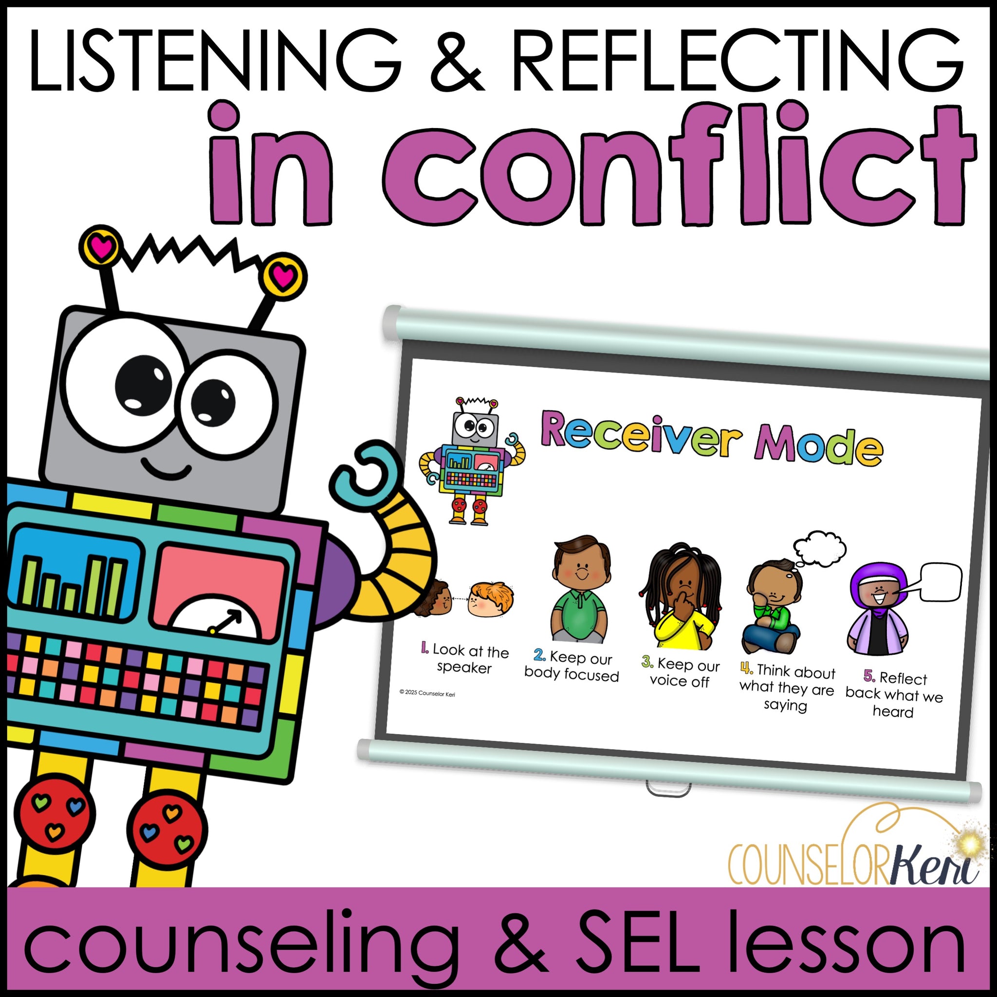 Listening & Reflecting Counseling Lesson & SEL Activity - This listening and reflecting counseling lesson plan will help students in grades 2-3 understand what listening and reflecting sound like and look like, and how they are helpful in a conflict. This lesson is part of a conflict unit and helps students understand the importance of communication in conflicts. The activity offers opportunities to collaborate with peers to practice reflecting for a variety of conflict scenarios. Use this activity as a part of your conflict unit.